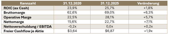 Ist eine Halbierung des Kurs-Gewinn-Multiples gerechtfertigt? Möglicherweise sind diese Unternehmen heute schlicht von geringerer Qualität als in der Vergangenheit? Die Daten sprechen dagegen. Kennzahlen zur Beurteilung der Qualität – von der Kapitalrendite (ROIC) bis hin zu Margen – haben sich insgesamt weiter verbessert: