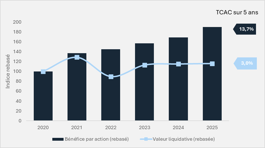 Tout aussi remarquable est la résilience des bénéfices des sociétés « quality growth » au cours de cette période mouvementée. Entre décembre 2020 et décembre 2025, les bénéfices du fonds Seilern World Growth ont progressé à un taux annualisé composé de 13,7 %, contre 3.0% pour la valeur liquidative (NAV).2
